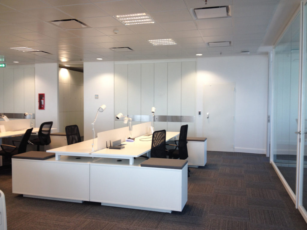 Oficinas ubicadas en el edificio Al Río, organizadas tipo open office, con algunas salas de reunión y oficinas gerenciales cerradas en los bordes.
